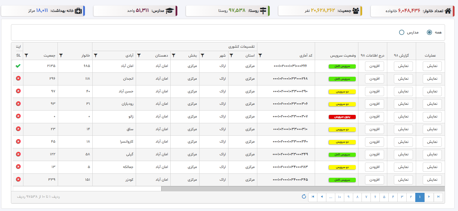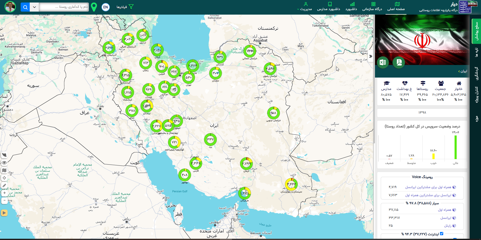 • مشاهده آمار و جزئیات مربوط به پوشش مخابراتی(اپراتورهای مختلف)، پوشش اینترنت، لایه‌های شهری و جغرافیایی، مکان‌های گردشگری، موزه‌ها، مدارس و …. در سطح روستاها