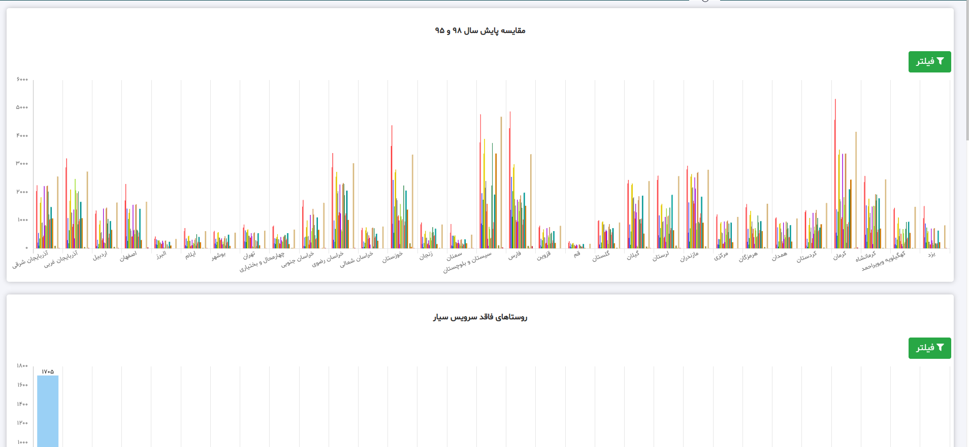 در ماژول داشبورد نمودارهای متعددی در معرض نمایش ما قرار دارد. به عنوان مثال نمودار مقایسه پایش‌های سال‌های مختلف که در این نمودار پایش‌های ثبت شده برای هر سال با سال دیگر به صورت نموداری مقایسه می‌شوند این پایش‌ها حاوی اطلاعاتی مانند سطح پوشش مخابراتی و اینترنتی اپراتورهای تلفن مختلف، تعداد مدرسه‌ها، خانه‌های بهداشت، دسترسی آسفالته، دسترسی خاکی، دسترسی مال‌رو، وضعیت برق خورشیدی و برق سراسری و…. است.
