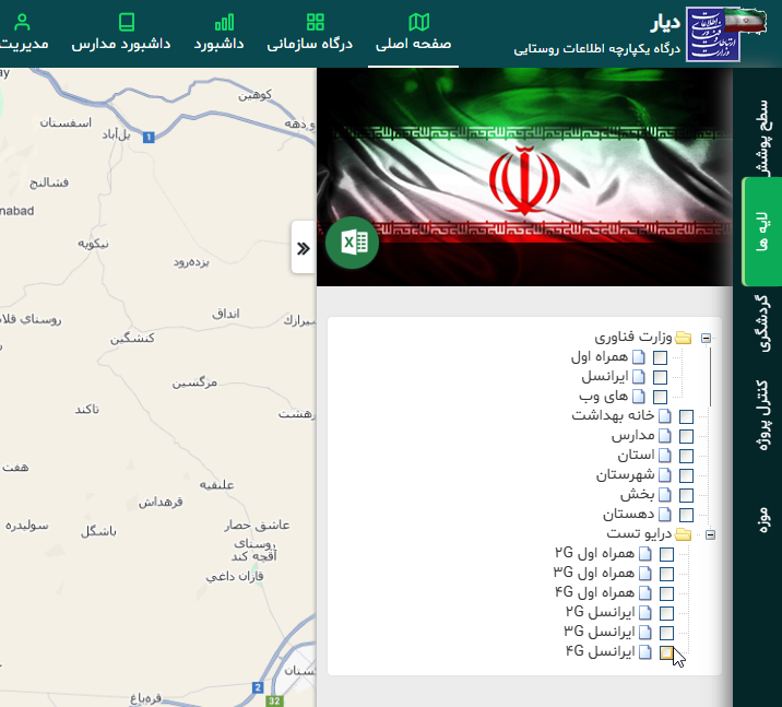 • امکان انتخاب لایه‌های مختلف از قبیل تقسیمات کشوری (استان، شهرستان، بخش، دهستان، روستا)، مدارس، موزه‌ها، مکان‌های گردشگری، پوشش مخابراتی و اینترنتی، کنترل پروژه